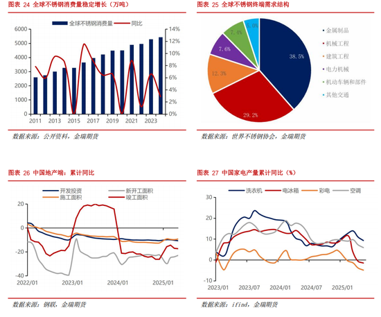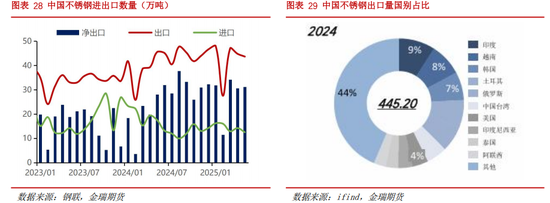下半年总体需求预期不佳,关注国内政策和传统旺季表现。从终端来看,不锈钢下游消费行业分散,五金日用和工业机械均有广泛分布。所以与黑色系不同,不锈钢产销与地产周期相关度较低,过去几年均能维持与宏观经济相近的增速,尽管价格整体一路下跌,但不锈钢基本能维持薄利高产的局面。然而2025年情况有所变化。需求端,年内来看,Q1关税预期+国补作用下,需求有一定前置情况,下半年关税或将逐步落地,叠加国补退坡,需求预期不佳。值得注意的是,中国不锈钢对美直接出口占比仅4%,可能的对越南出口占比也只有8%,美国关税冲击对不锈钢整体需求的负面影响粗略估计可控制在5%以内,但国补刺激作用逐渐退坡后的内需预期亦相对悲观,后续关注国内政策储备,和传统旺季的现货需求表现。总体而言,下半年不锈钢需求预期不佳,短期行情节奏关注龙头钢厂动向。