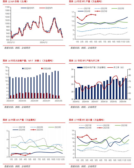 印尼NPI产量超预期增长。2025上半年,除2月因德龙股权转移期导致一定减产外,整体上印尼NPI产量实现了超预期增长,月产超15万金属吨,主因Q1下游不锈钢的超预期扩产,部分冰镍产能转产镍铁;Q2尽管价格坍塌式下跌,但印尼NPI开工率却并未见到下降,各铁厂当前减产意愿不强。国内NPI产量则一如既往保持低位稳定,供应一体化钢厂。