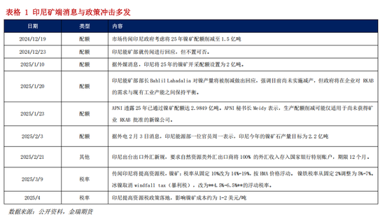 Q1减量/加税等传闻多发,刺激镍价上行。2024年12月起,印尼镍矿方面传闻多发,或削减配额或提高资源税。事后看,大幅削减配额仅停留在传闻和表态阶段,市场已有一定脱敏,盘面反应并不明显,仅计入印尼镍矿供应偏紧的预期。不过2月底以来市场传闻印尼出台出口外汇管制以及加征资源税等政策,并且这些政策随后均得以落地,对镍矿成本端产生一定抬升作用,3月镍矿价格以及镍价均加速上行。