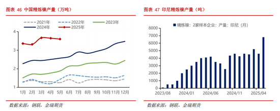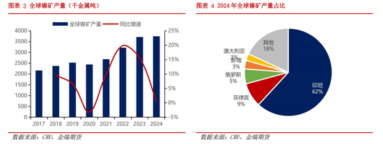 海外传统精炼镍产量基本保持稳定。俄镍即诺尔里斯克等传统海外上市镍企2025年镍产量指引基本与24年产量持平,验证了我们此前关于海外产能出清结束的观点,余下产能均位于印尼边际成本左侧位置,产量可基本维持稳定。