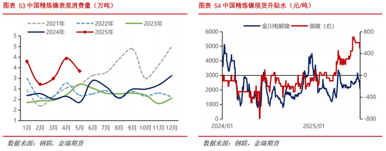 需求端额外支撑带动去库,然盘面反应并不积极。精炼镍需求较为分散,从库存和现货市场来看,2025上半年需求有额外支撑,国内持续去库,LME停止累库,25上半年仅累库3.2万吨,表消处于高位;现货升贴水尤其是俄镍升贴水处于高位。精炼镍需求端额外支撑上半年持续发力。但值得注意的是,尽管库存和现货表现不俗,但市场对于额外需求的持续性存有隐忧,且其本身对价格便较为敏感,对于镍价而言更多是托底而非向上驱动的作用,实际上盘面对国内持续去库的反应并不积极。下半年持续性有待观察。